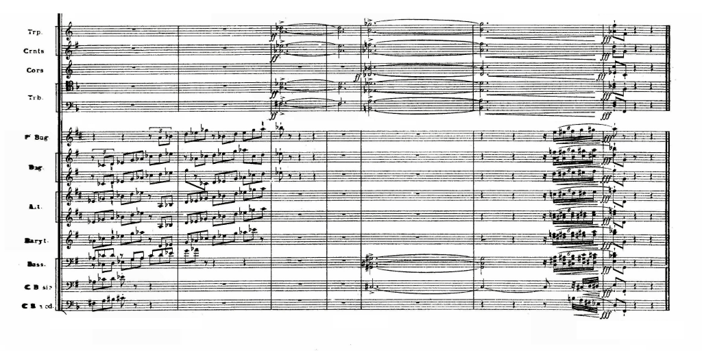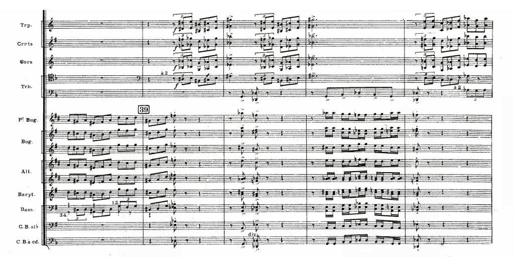 練習番号を境に、下の9段がサクソルン属、上5段がそれ以外の金管楽器群です。