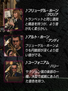 また、本作品中に登場する ブラスバンド(金管バンド)は、Trb.が編成に加わっています。